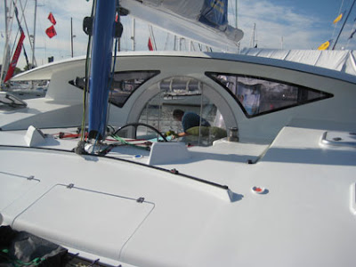 The Moxie 37 Island Hopper, designed and built in South Africa by Uwe Jaspersen, was one of the boats that surprised me at the Annapolis Boat Show. It’s a fast looking cruising catamaran with large open bridge deck that’s covered by a curved roof. The helm station (and all sail controls) are at the base of the mast (a la Gunboat cats) but the Moxie is not affiliated with Gunboat in any way. It’s light overall weight (aprox 7,000 pounds), powerful square topped fully battened main set on a rotating wing mast and several options for large reaching sail combinations make it easy for the Moxie to reel off speeds in low teens.